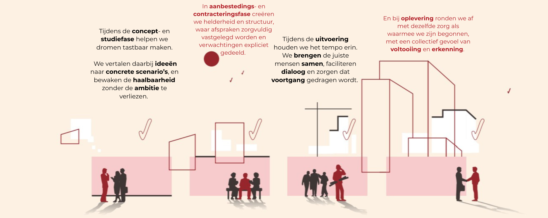 We begeleiden het volledige traject, van de eerste concepten tot de finale oplevering. In elke fase nemen we onze rol op als betrouwbare coördinator, met oog voor mens én proces.